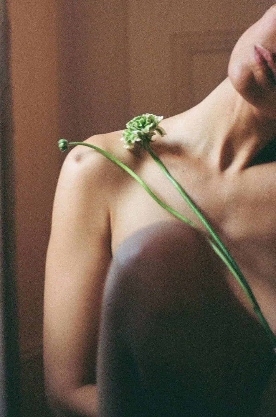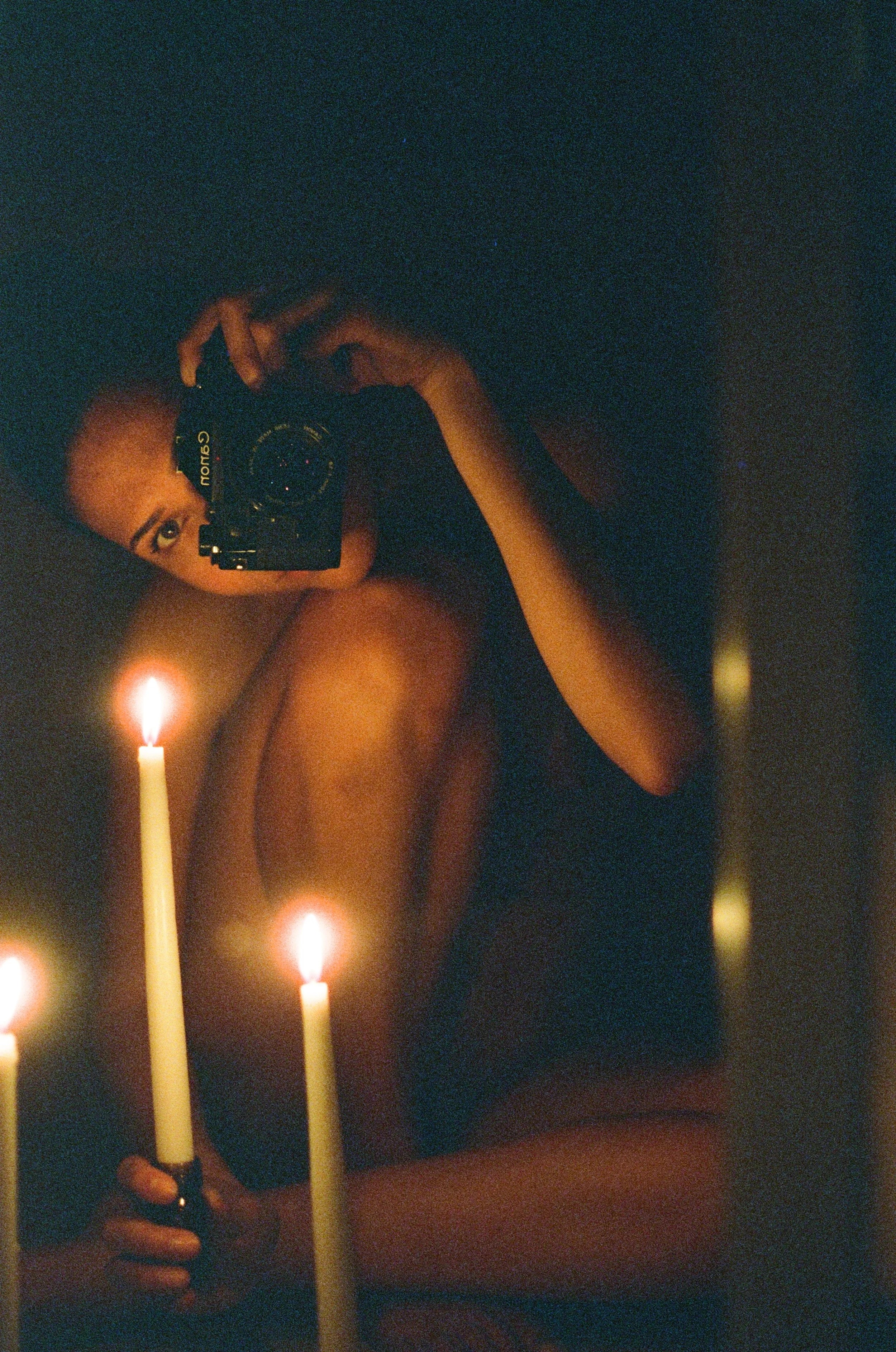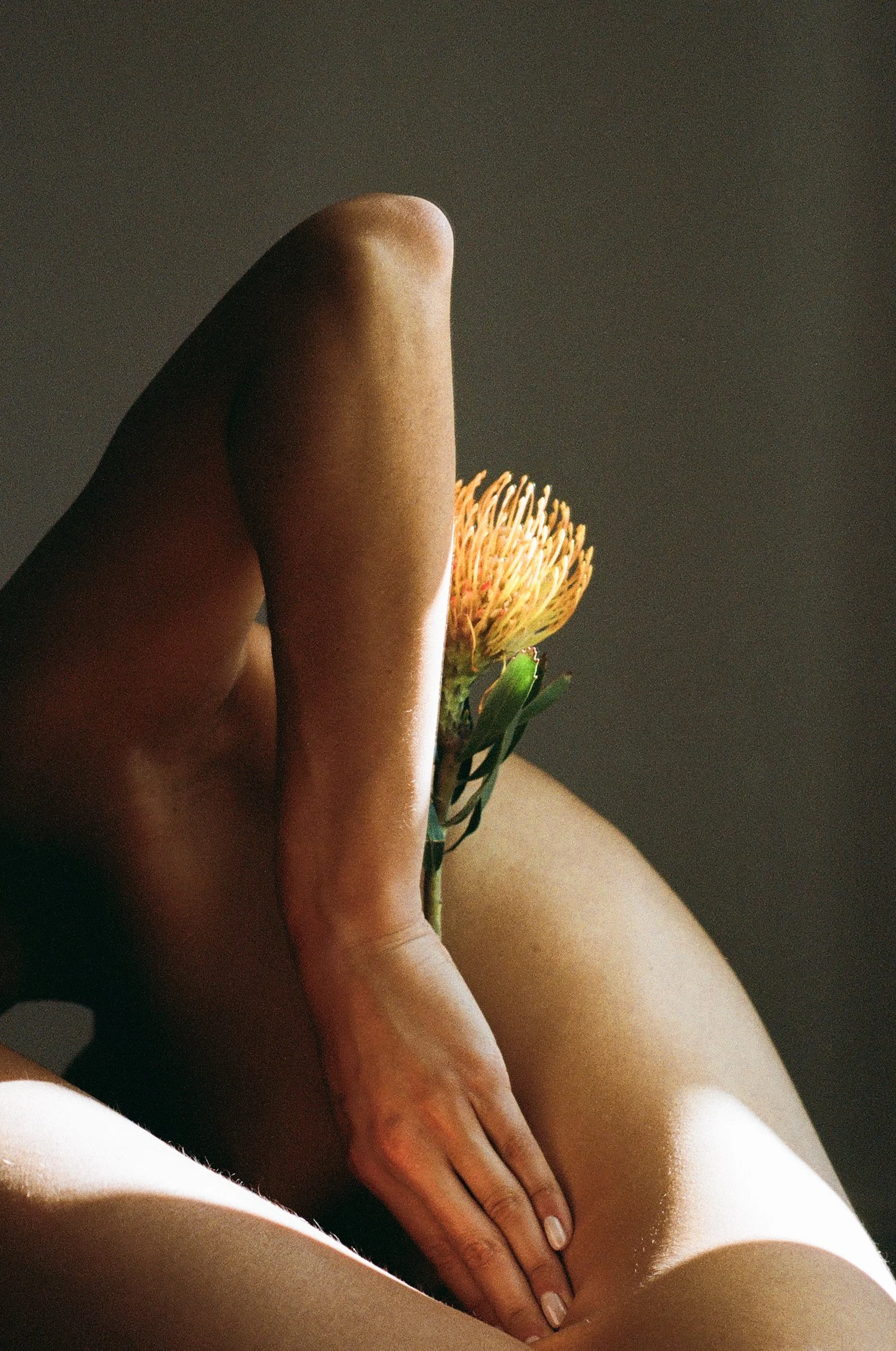 A woman with brown hair styled in a messy bun, sitting with her knees drawn up, in natural light with shadow across her face, in a cozy indoor setting.