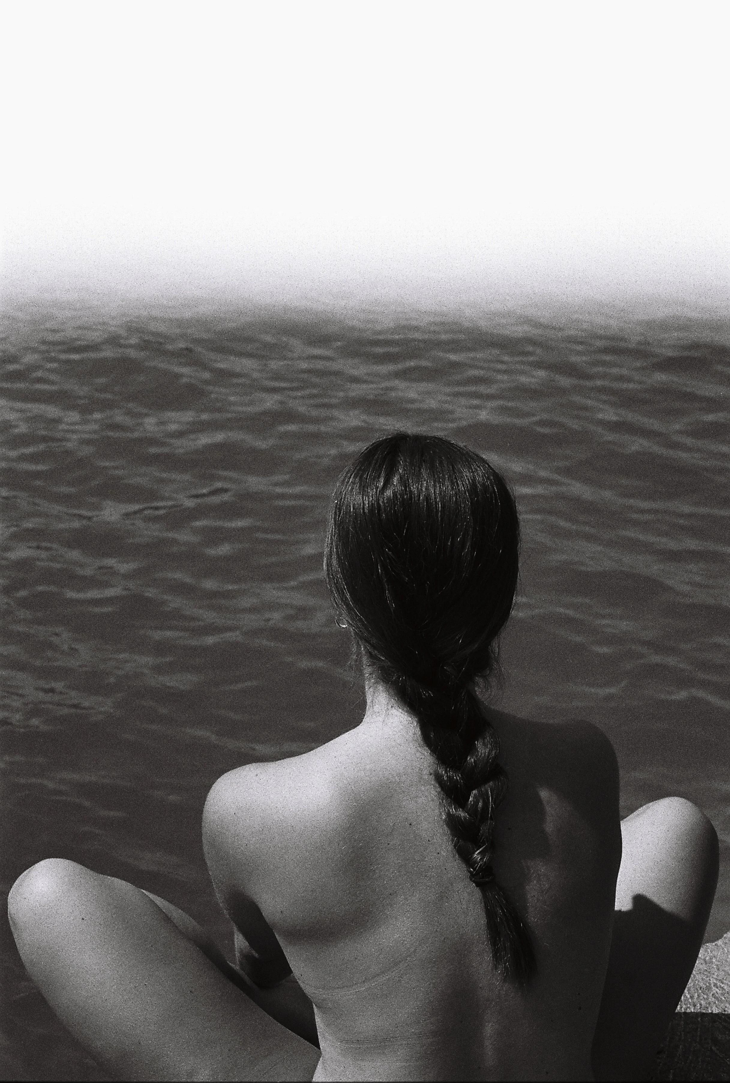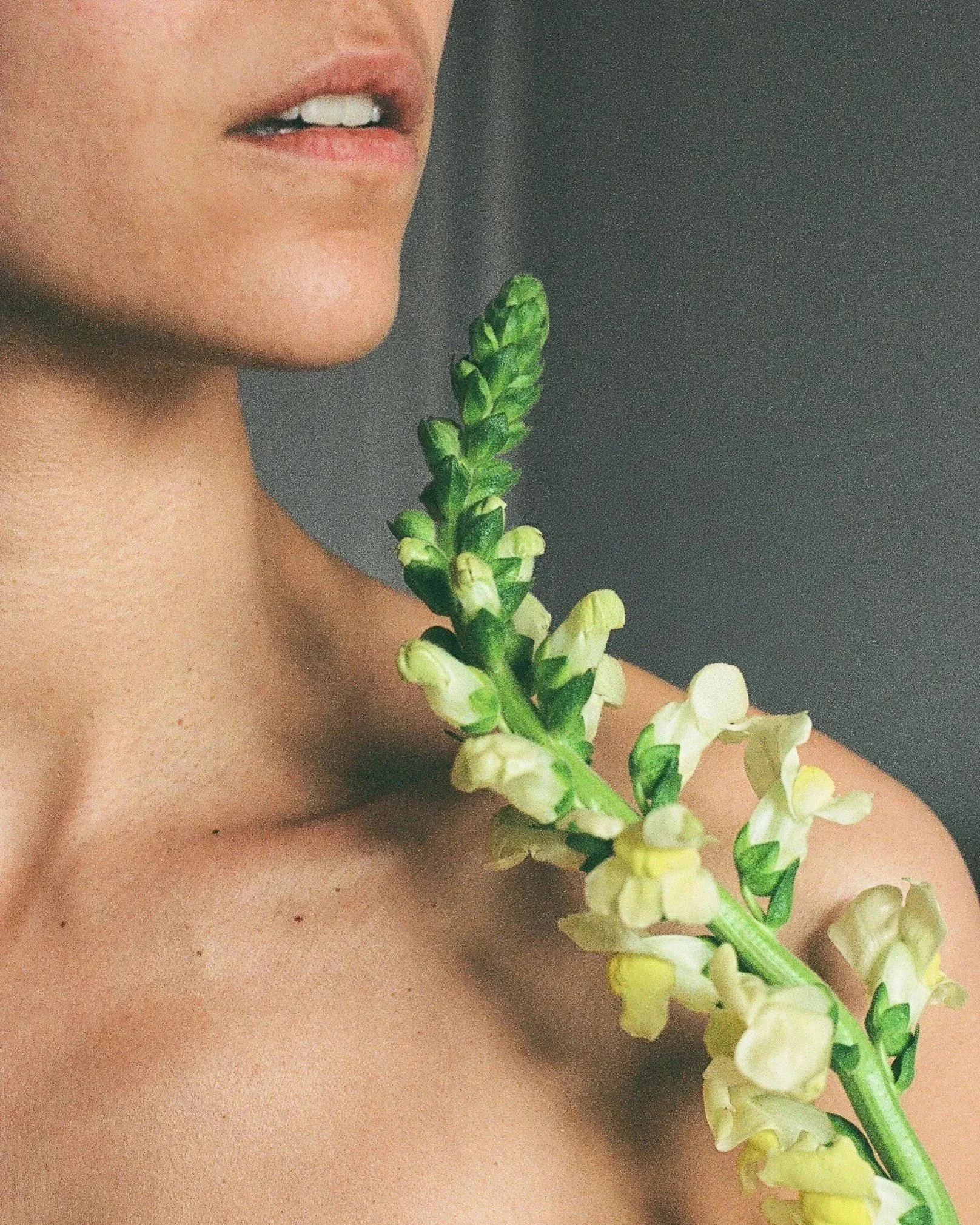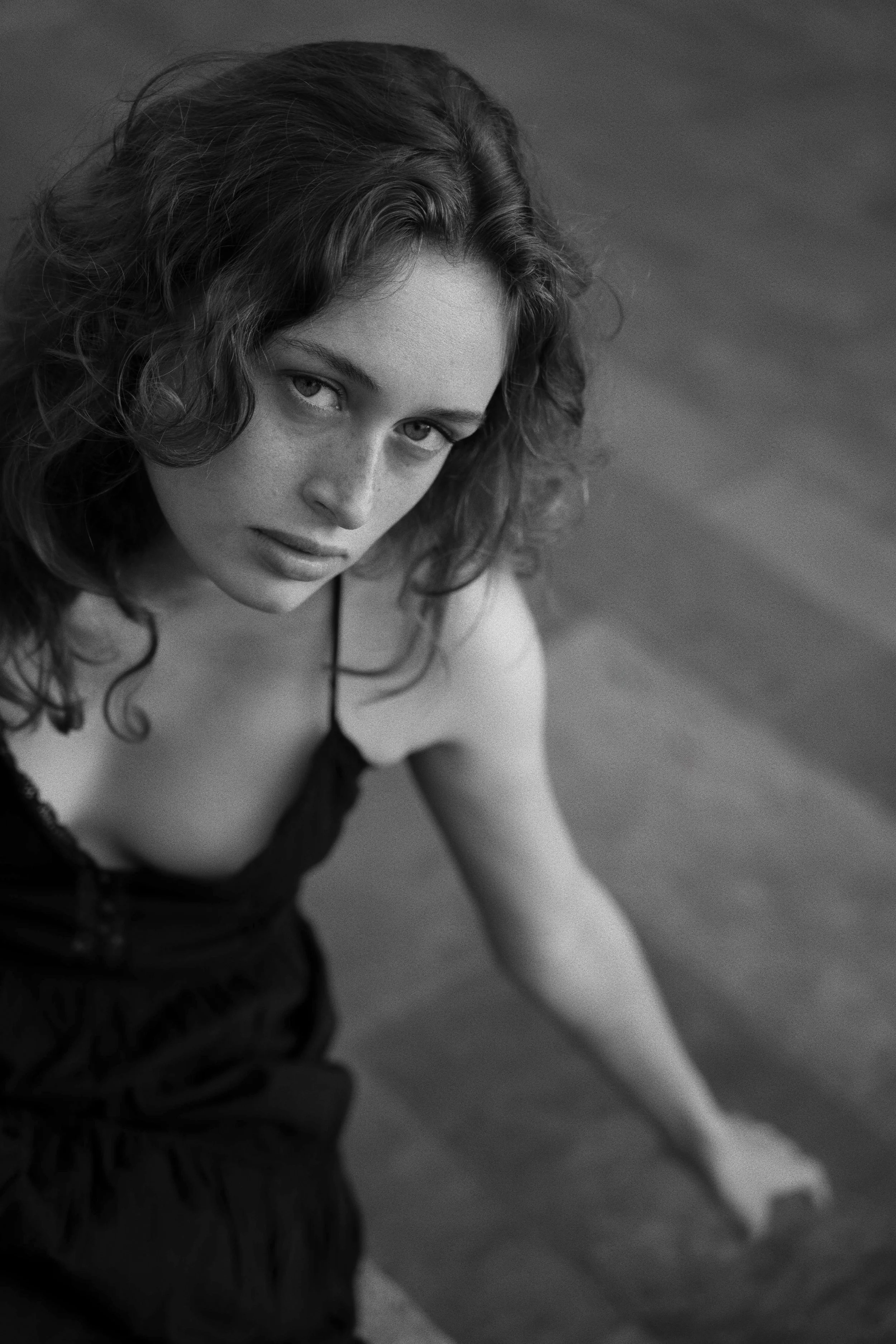 A woman with brown hair styled in a messy bun, sitting with her knees drawn up, in natural light with shadow across her face, in a cozy indoor setting.