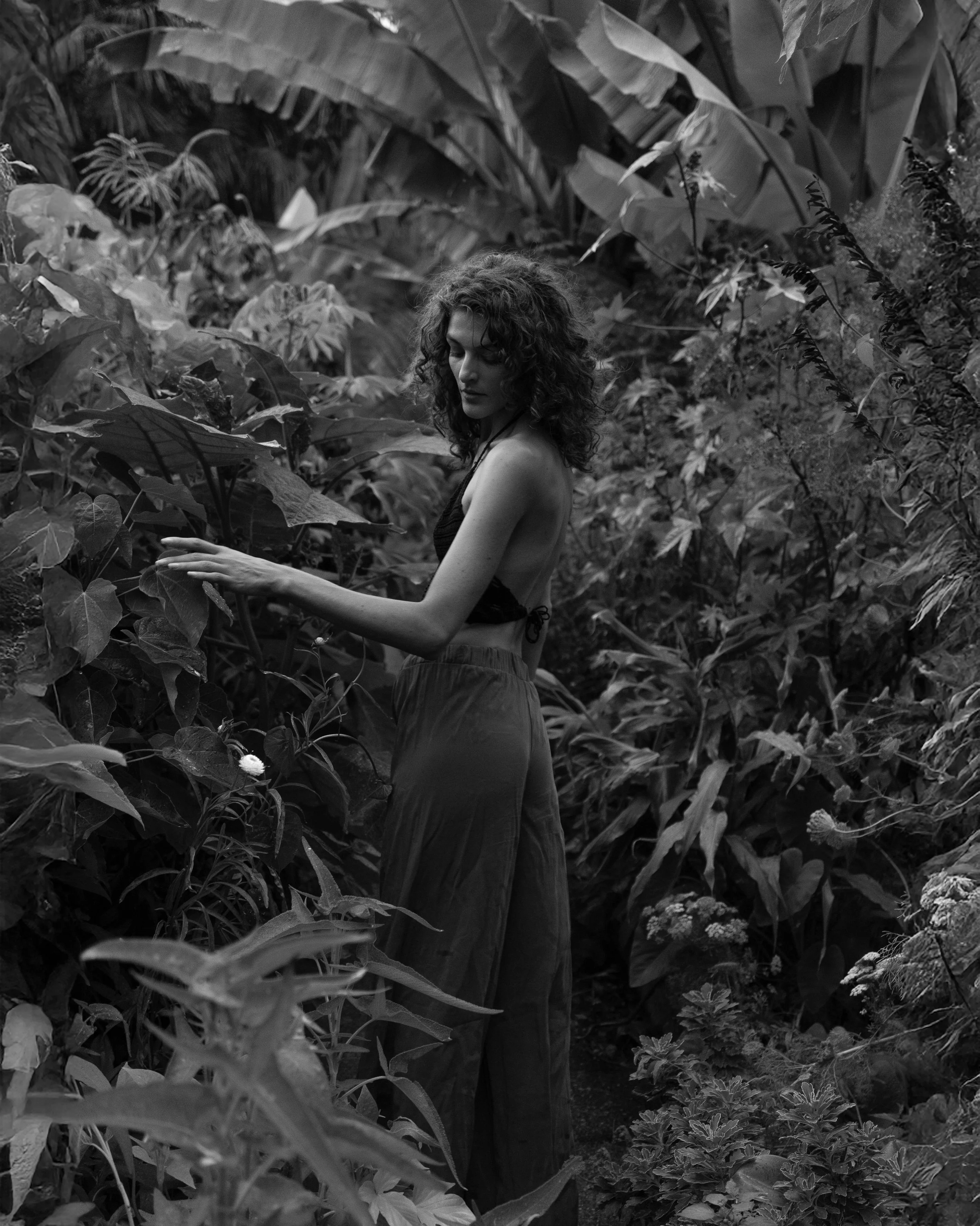 A woman with curly brown hair resting her head on a horse's body, outdoors in a wooded area with sunlight.